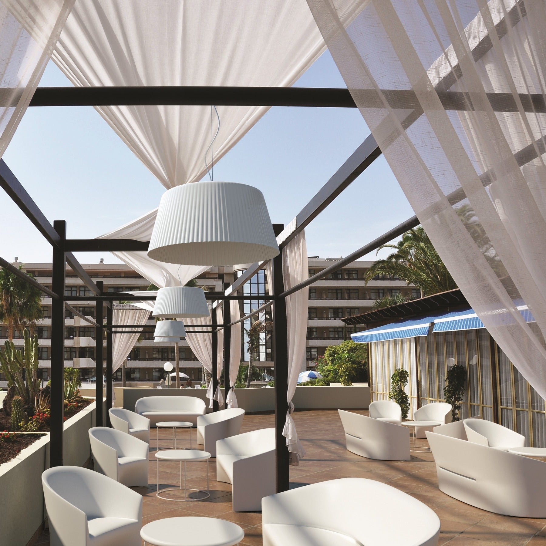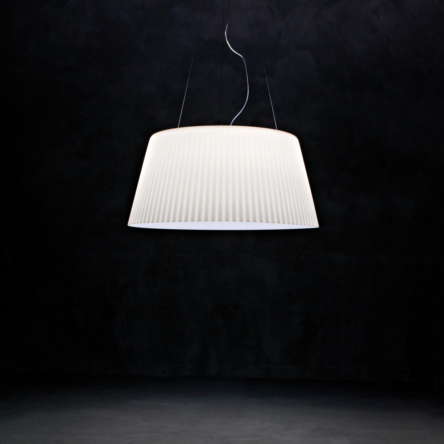 The shade folds back with a striking design that masks the light source like a filter. This technical and aesthetic solution allows for greater visual comfort and softer atmospheres. Inside the lamp there are two distinct light sources that can be switched on individually or at the same time for different levels of luminosity.