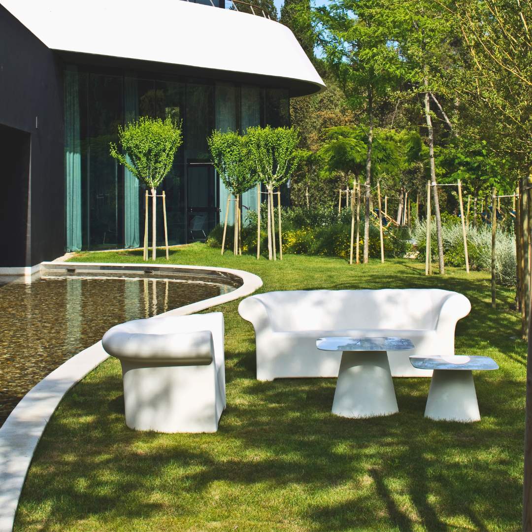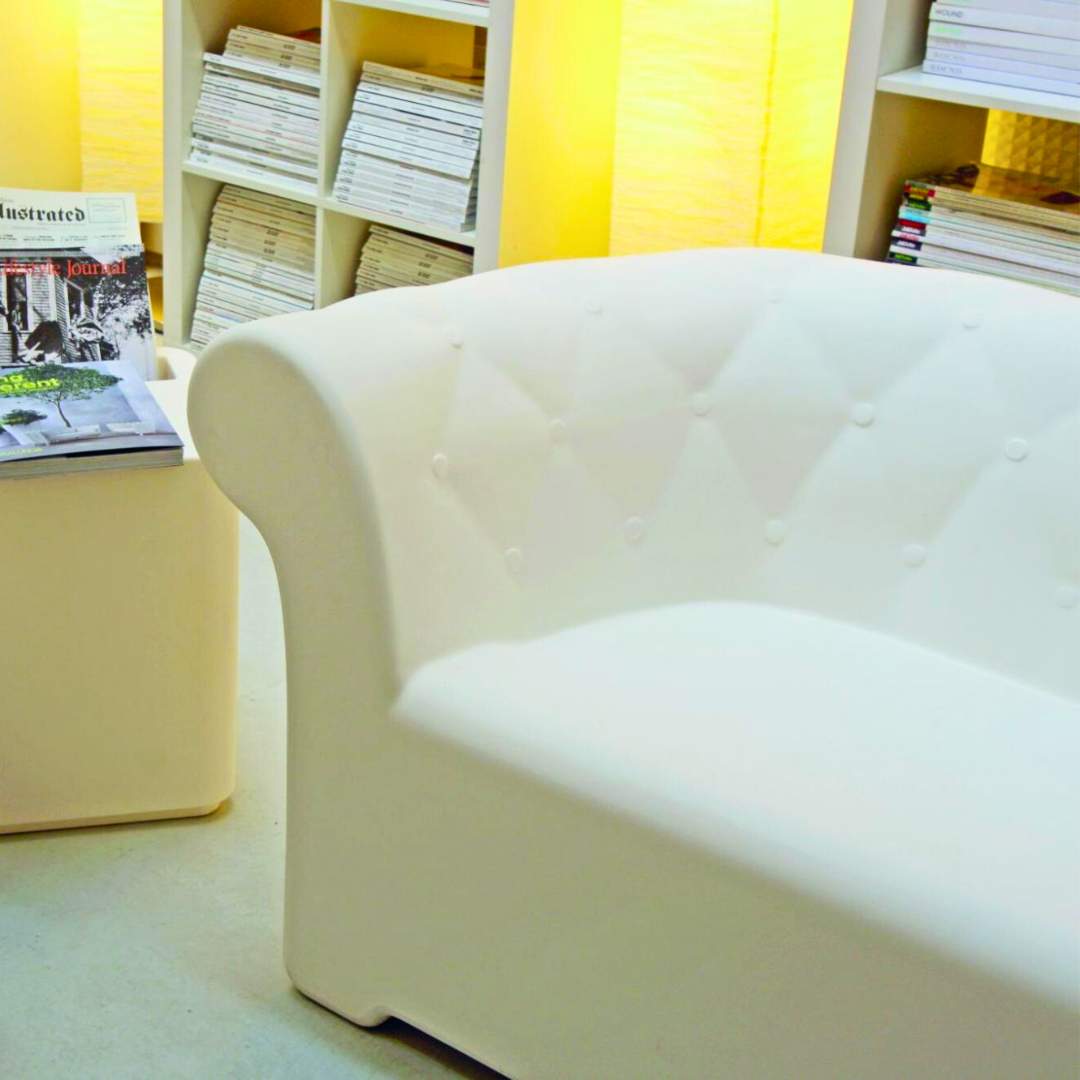 Il concetto iniziale era molto chiaro: quello di creare divani da esterno comodi e funzionali. La sinergia tra design e forma è stata resa possibile grazie al know-how dell'azienda Serralunga che, attraverso la tecnologia rotazionale, ha creato una forma evocativa in grado di conservare caratteristiche particolari, come l'effetto imbottito, dell'originale poltrona inglese.